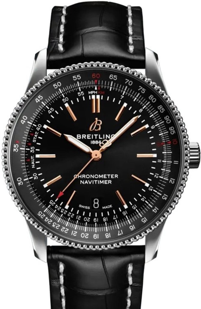 Модель классических часов для мужчин с официальным статусом хронометра Navitimer 1 Automatic 41 A17326241B1P2 представил часовой бренд Breitling в 2020 году. Часы имеют круглый корпус из нержавеющей стали, размером 41 мм. Автоматический калибр Breitling 17 обладает 38-часовым запасом хода. Циферблат черного цвета накрыт стеклом из натурального сапфирового кристалла с противобликовыми свойствами. Стрелки, а также часовая разметка, что служат для индикации времени, выполнены из розового золота и покрыты люминесцентным составом, который светится в темноте. Безель вращается. Ремень из натуральной кожи аллигатора черного цвета поставляется со вставкой из нержавеющей стали. Водонепроницаемость корпуса - 30 метров.