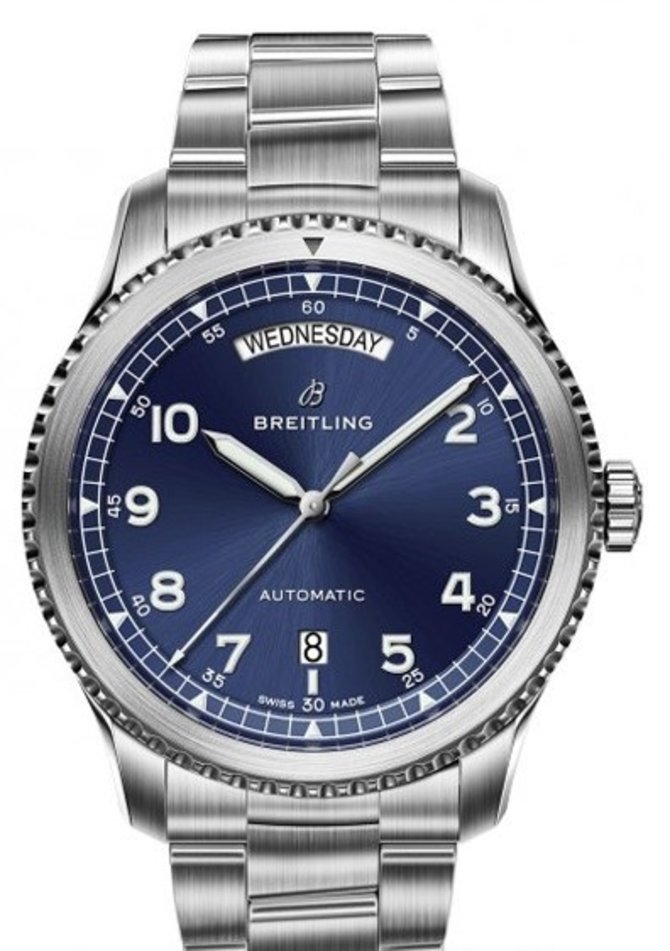 Breitling Navitimer 8 Automatic Day & Date 41 A45330101C1A1 - это швейцарские механические часы, выпущенные часовой маркой Breitling. Модель оснащена автоматическим мануфактурным механизмом Breitling 45 с 38-часовым запасом хода и индикацией часов, минут, секунд, даты, дней недели на циферблате синего цвета. Корпус часов, диаметром 41 мм, выполнен из нержавеющей стали. Стальной браслет дополнен раскладной застежкой. Стрелки покрыты люминесцентным покрытием белого цвета, которое светится в темноте. Герметичность корпуса - 100 метров. Стекло на циферблате выполнено из чистого сапфирового кристалла с антибликовым составом. Безель вращается.