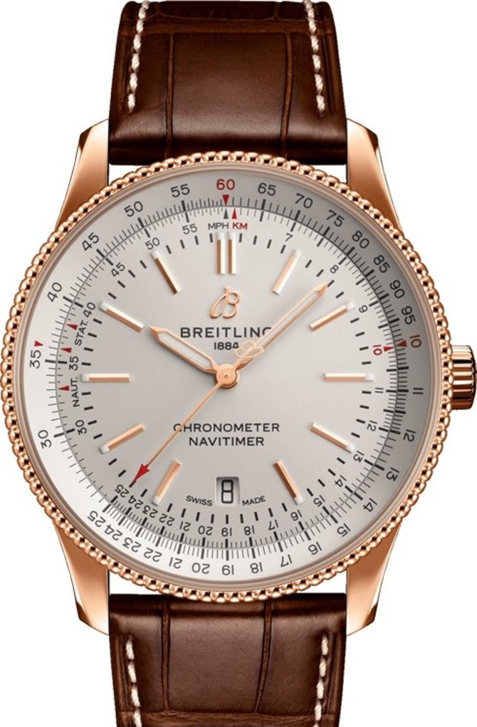 Компания Breitling в 2020 году выпустила мужскую модель швейцарских часов с функцией хронографа Navitimer 1 Automatic 41 R17326211G1P1. Часы имеют круглый корпус из розового золота, размером 45 мм. Автоматический калибр Breitling 17 со статусом хронометра способен проработать без подзавода на протяжении 38 часов. Циферблат накрыт стеклом из натурального сапфирового кристалла с противобликовыми свойствами. Стрелки и часовые метки из золота для индикации времени покрыты люминесцентным составом, который светится в темноте. Модель поставляется с ремнем из кожи аллигатора коричневого цвета и классической застежкой из розового золота. Водонепроницаемость корпуса - 30 метров. Безель вращается.