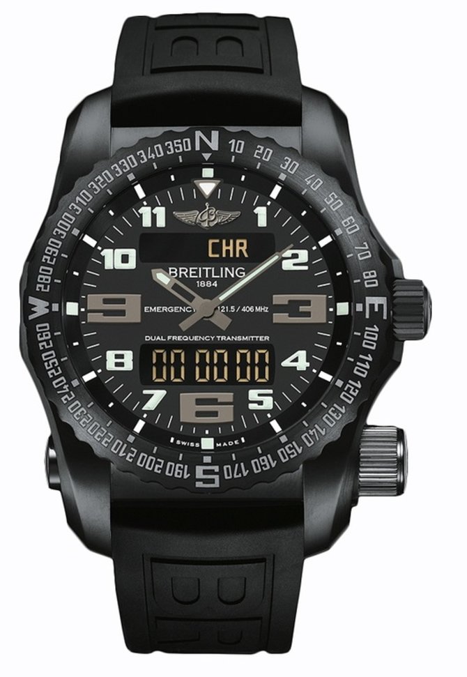 Профессиональные швейцарские часы от компании Breitling - новинка бренда, выпущенная в 2017 году. Часы отличаются встроенным двухчастотным индивидуальным приводным радиомаяком. Модель послужит как для подачи аварийного сигнала, так и для пеленга в процессе поисково-спасательных операций. Циферблат комбинированный, с аналогово-электронной индикацией данных. Часы многофункциональны. Функциональный набор: индикация - часы, минуты, секунды, дата, дни недели; усложнения - хронограф, вечный календарь, таймер обратного отсчета времени, GMT (индикация времени второго часового пояса), будильник, индикатор срока замены батареи, радиомаяк. Часы работают на кварцевом механизме Breitling 76 SuperQuartz™. Корпус, диаметром 51 мм, из титана с DLC-покрытием. Циферблат накрыт сапфировым стеклом. В комплекте - ремешок из каучука. Герметичность корпуса - 50 метров. Гарантия на представленную модель - 2 года. Международная гарантия действует как на территории Украины, так и по всему миру.