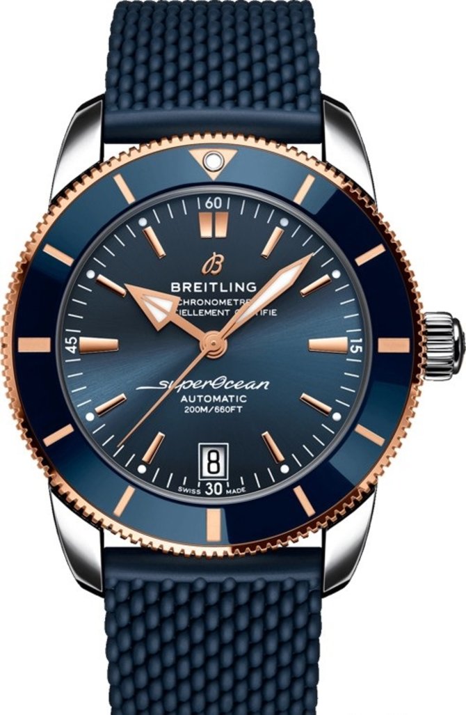 Модель мужских швейцарских часов Superocean Heritage II B20 Automatic 42 UB2010161C1S1 от компании Breitling выпущена производителем в круглом корпусе, диаметром 42 х 14.35 мм, из нержавеющей стали и розового золота. Под сапфировым стеклом на синем сатинированном циферблате установлены золотые часовые метки и стрелки с люминесцентным составом для возможности считывания показаний данных в темноте. Автоматический сверхточный механизм Breitling B20 обеспечивает модель такими функциями: часы, минуты, секунды, дата. Запас хода механизма - 70 часов. Браслет выполнен из каучука. Раскладная пряжка из стали в комплекте. Водонепроницаемость корпуса - 200 метров.