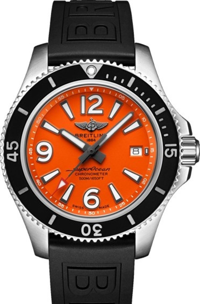Швейцарская марка Breitling презентовала часы, что вошли в коллекцию Superocean - модель Automatic 42 A17366D71O1S1. Часы отличаются дайверским уровнем герметичности корпуса (до 500 метров, 50 бар), а также наличием сертификата хронометра COSC. Установленный автоматический калибр Breitling 17 имеет запас хода на 38 часов работы. Корпус выполнен из нержавеющей стали в размере 42 х 13.3 мм. На оранжевом циферблате показываются такие данные: часы, минуты, секунды, дата. Стрелки и метки заполнены люминесцентным покрытием. Индикатор даты установлен на уровне отметки "3 часа". Безель вращается в одном направлении. Часы выпущены в 2019 году.