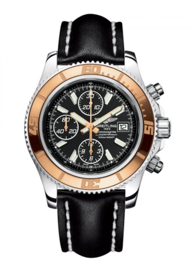 В настоящее время, наручные часы Breitling являются одними из самых ярких и стильных измерителей времени с авиационным дизайном. А качество этих сертифицированных хронографов делает их необыкновенно популярными среди людей, имеющих самые разные профессии.Эта модель, представляющая собой хронограф в дизайне часов Superocean, сохраняет водонепроницаемость на глубине до 500 м (1.650 футов). В ней сочетается молодёжная, динамичная и современная внешняя отделка и превосходный механизм с автоподзаводом, имеющий сертификат хронографа от Швейцарского бюро по сертифицированию хронометров (Swiss Official Chronometer Testing Institute (COSC)). Секундная стрелка, мини-окошко календаря и название модели выполнены с применением цветовых акцентов, создающих элегантный контраст с чёрным циферблатом, дающим возможность превосходно рассмотреть время. Особо прочный корпус снабжён заводной головкой с блокировкой и нажимными кнопками, воспользоваться которыми можно только когда они расфиксированы. Имеются версии с безелем из стали и из розового золота.