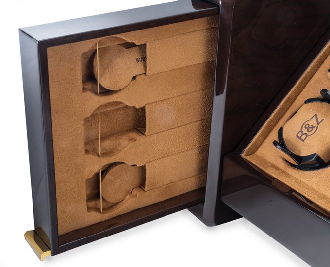 Каркас шкатулки для хранения 12-ти часов с автоматическим подзаводом изготовлен из белого ясеня. Кроме автоматических моделей, здесь можно хранить дополнительно 6 часов в двух боковых секциях с ручным подзаводом или модели на кварцевом механизме. Дерево покрыто темно-коричневым лаком. Позолоченные ручки сделаны из латуни. Корпус представлен в таких габаритах: 655 х 236 х 230 мм. Шкатулка с автоматическим подзаводом часов Buben & Zorweg Time Mover Evolution 12 - это отличное гармоничное сочетание дизайна, качества производства и функциональных возможностей аксессуара. Отметим, что прибор работает практически бесшумно (уровень шума не более 5dB). Скорость вращения прибора около 8 оборотов в минуту. Источником питания может выступать как переменный ток 220V, так и 2 батарейки 1,5V. Внутренняя отделка выполнена нубуком в стиле "табак".
