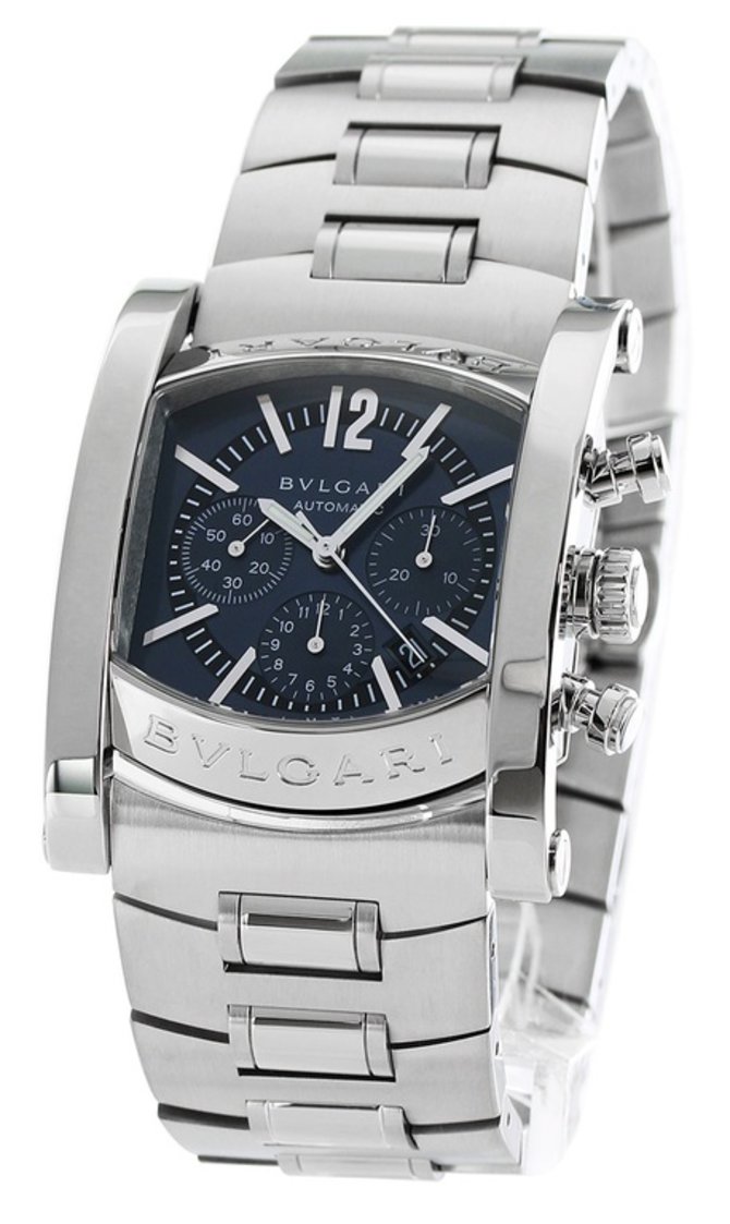 Мужские часы с хронографом представлены швейцарским часовым брендом Bvlgari в прямоугольном корпусе из нержавеющей стали, диаметром 44 миллиметра. Модель с помощью мануфактурного швейцарского механизма с автоподзаводом от компании Bvlgari и циферблата информирует о текущем времени (часы, минуты, секунды), дате и данных хронографа. Запас хода механизма - 42 часа. Часы поставляются со стальным браслетом и раскладной застежкой. Герметичность корпуса - 30 метров. Циферблат под сапфировым стеклом. На края корпуса нанесена брендовая гравировка Bvlgari.
