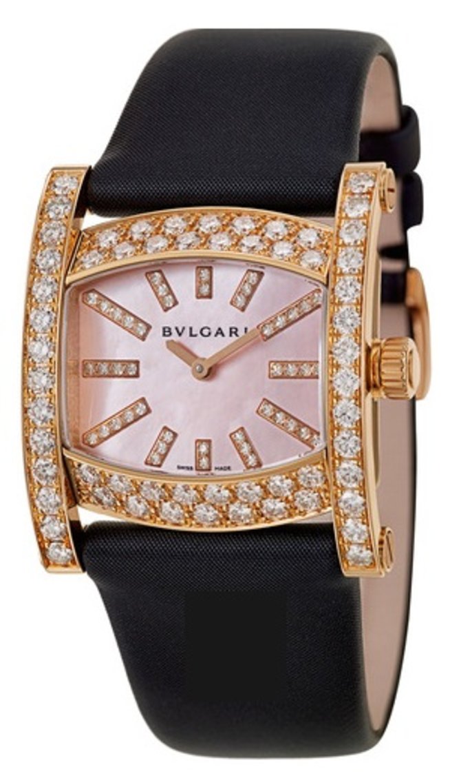 Стильные и элегантные женские наручные часы от швейцарской компании Bvlgari представлены в прочном корпусе из розового золота с инкрустацией бриллиантами. В швейцарских часах установлен кварцевый мануфактурный часовой механизм от Bvlgari. Он обеспечивает индикацию часов и минут на перламутровом циферблате. Диаметр корпуса - 36 миллиметров. Ремешок сатиновый. Застежка классическая, золотая. Герметичность корпуса - 30 метров.