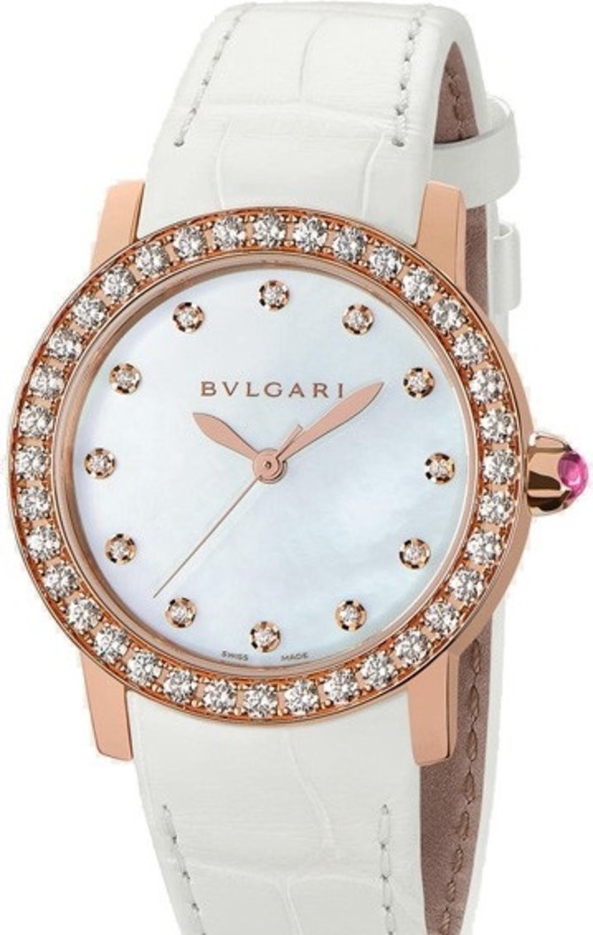Итальянский бренд Bvlgari, владеющий мануфактурой по производству часов и механизмов класса люкс в Швейцарии, представил ювелирные наручные часы для женщин, которые на базе мануфактурного механического калибра с автоматическим подзаводом В77 указывают на перламутровом циферблате часы, минуты, секунды. Индикация данных осуществляется лепесткообразными стрелками из золота. Бзелеь корпуса инкрустирован белыми бриллиантами классической огранки. Такие же драгоценные камни представлены производителем на месте часовых меток, в количестве 12 штук. Стекло выполнено из сапфирового кристалла и покрыто специальным противобликовым составом. Ремень белого цвета из кожи аллигатора дополнен классической вставкой из золота. Корпус из чистого золота.