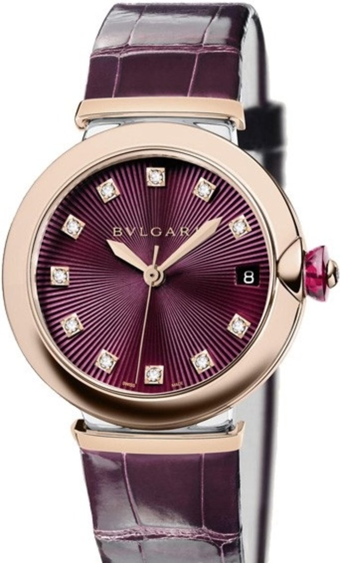 Часы, минуты, секунды и дата - такие данные отображаются на фиолетовом сатинированном циферблате женских наручных часов Bvlgari Lvcea 102565. Индикация осуществляется посредством золотых стрелок и меток, предложенных производителем в виде белых бриллиантов классической огранки. Стекло из сапфирового кристалла, установленное на лицевой части модели, покрыто специальным люминесцентным составом. Ремешком из натуральной кожи аллигатора нежного фиолетового цвета часы фиксируются на руке. Выполнение функций обеспечено мануфактурным швейцарским механизмом В77 от компании Bvlgari, который отличается автоматическим подзаводом и запасом хода на 42 часа.