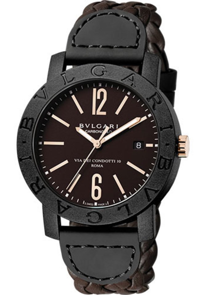Версия моделей из серии Bulgari Carbon Gold представлена в коричневом цвете. Коричневый циферблат с часовыми стрелками и метками из розового золота. Также из золота выполнена и заводная головка часов. Сам корпус изготовлен из черного углеродного волокна (карбона), на безель которого нанесена уникальная фирменная гравировка с двойным содержанием "Bulgari". Еще в коричневом цвете представлен ремешок, которым комплектуются часы. Он пошит вручную из натуральной кожи теленка, украшен уникальным плетением и доукомплектован классической пряжкой. И задняя, и лицевая часть корпуса накрыты сапфировым стеклом. Запас хода механизма - 42 часа.