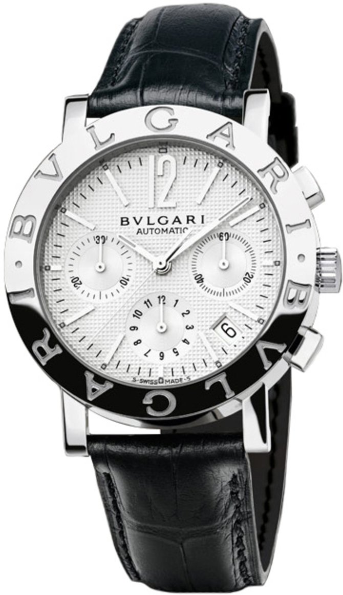 Продажа мужских наручных швейцарских часов #Bvlgari_Bvlgari_Bvlgari_Chronograph_38_mm, #часы_ref._BB38WSLDCH/N. Модель от мануфактуры Bvlgari представлена в шикарном корпусе круглой формы с ручной гравировкой, выполненном из качественной нержавеющей стали. В стальном корпусе, диаметром 38 миллиметров, мастерами компании Bvlgari размещен автоматический механический калибр с хронографом, который гарантирует индикацию на белом гильошированном циферблате часов, минут, секунд, даты и данных хронографа. Механизм обладает 42-часовым запасом хода. Модель Bvlgari Chronograph 38 mm BB38WSLDCH/N, вошедшая в коллекцию Bvlgari Bvlgari, укомплектована ремешком из натуральной кожи аллигатора черного цвета и дополнена застежкой из стали. Водонепроницаемость не высокая - 30 метров.