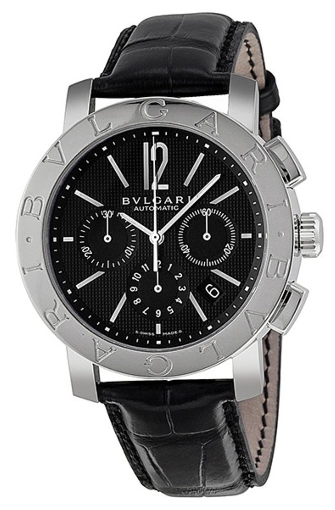 Представленные часы с автоматическим механизмом и хронографом, расположенным внутри 42-миллиметрового корпуса из нержавеющей стали, пополнили коллекцию "Bvlgari Bvlgari". На стильном черном гильошированном циферблате указываются часы, минуты, секунды, дата и данные счетчиков хронографа. Стрелки и часовые метки - скелетонизированные. Запас хода калибра - 42 часа. Герметичность корпуса - 30 метров. Часы укомплектованы черным ремешком из кожи крокодила. Застежка классическая. На стальной безель нанесена гравировка с названием бренда "Bvlgari". Заводная головка рифленая. Пушеры хронографа расположены вокруг заводной головки.