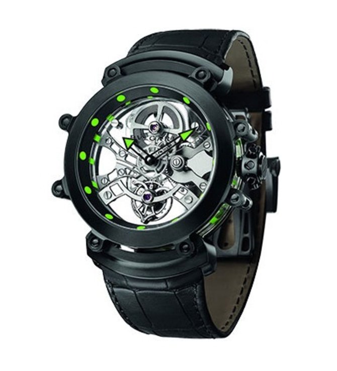 53-миллиметровый титановый корпус с черным DLC-покрытием хранит внутри себя механический калибр GG 8000 с ручным подзаводом и турбийоном. Минимальный запас хода этого механизма составляет 70 часов. Сквозь защитное сапфировое стекло можно увидеть индикацию текущего времени, окно турбийона и работу всего мануфактурного механизма, так как циферблат полностью скелетонизированный. Стрелки и часовые метки наполнены светящимся в темноте зеленым люминесцентным покрытием SuperLuminova. Ремешок, которым компания Bulgari укомплектовала модель "Tourbillon Saphir Ultranero", пошит из натуральной кожи крокодила черного цвета и наделен раскладной титановой застежкой. Цена на представленный часовой шедевр, рекомендованная производителем - $ 210 000. Часы выпущены ограниченным тиражом в 30 экземпляров.