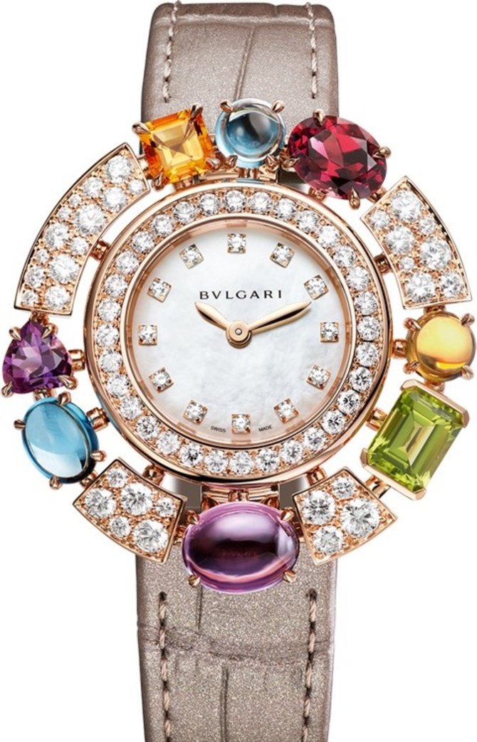 Ювелирные часы Diva Allegra 103493 от швейцарской марки Bvlgari представлены в круглом корпусе из розового золота, диаметром 36 мм, что инкрустирован набором драгоценных камней: белыми бриллиантами и разноцветными драгоценными сапфирами. В часах установлен кварцевый мануфактурный калибр от специалистов Bvlgari. Он обеспечивает показания часов и минут на циферблате из натурального морского перламутра золотыми стрелками, указывающими на бриллиантовую часовую разметку. В комплекте с часами поставляется ремень из натуральной кожи крокодила и классическая вставка из золота. Часы Diva Allegra 103493 были выпущены Bvlgari в 2021 году.