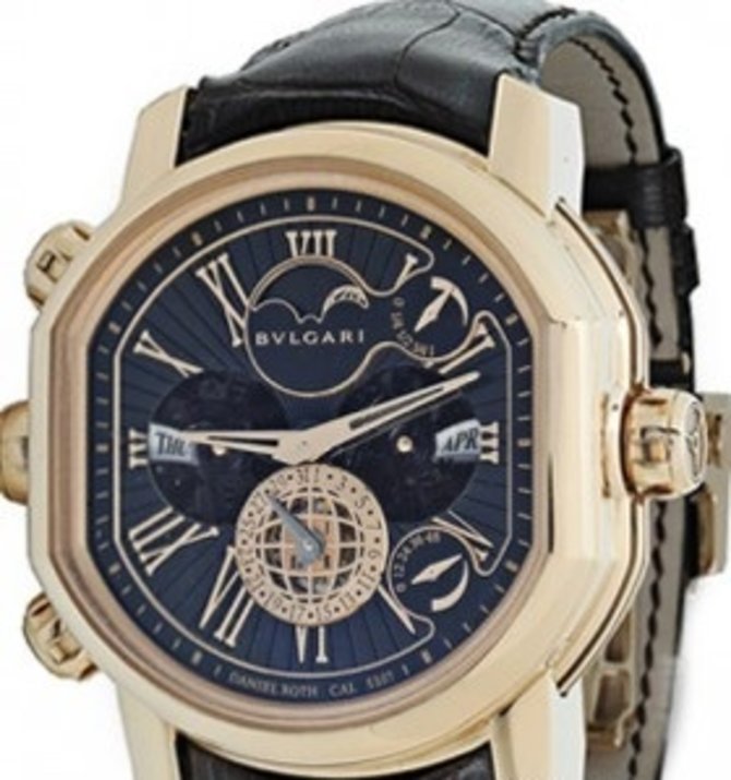 Модель "Bvlgari Daniel Roth Grande Sonnerie Quantieme Perpetual BRRP48GLTBGSQP/1" выпущена в 48-миллиметровом корпусе, изготовленном из розового 18-каратного золота. Герметичность корпуса минимальная - 30 метров. Ремешок пошит из натуральной кожи крокодила. Застежка классического типа выполнена из розового золота. Часы входят в коллекцию "Daniel Roth" торговой марки Bvlgari. Ранее, до 2000 года, Daniel Roth был независимым брендом, однако в начале нового тысячелетия марку выкупила компания Bvlgari. На многофункциональном циферблате указываются часы, минуты, секунды, дата, день недели, месяц, фаза луны, цикл високосного года. Модель оснащена минутным репетиром, вечным календарем и турбийоном. Циферблат под защитой сапфирового стекла. Механизм DR 5307, функционирующий от автоподзавода, выполнен вручную инженерами компании Bvlgari. Запас хода - 48 часов.