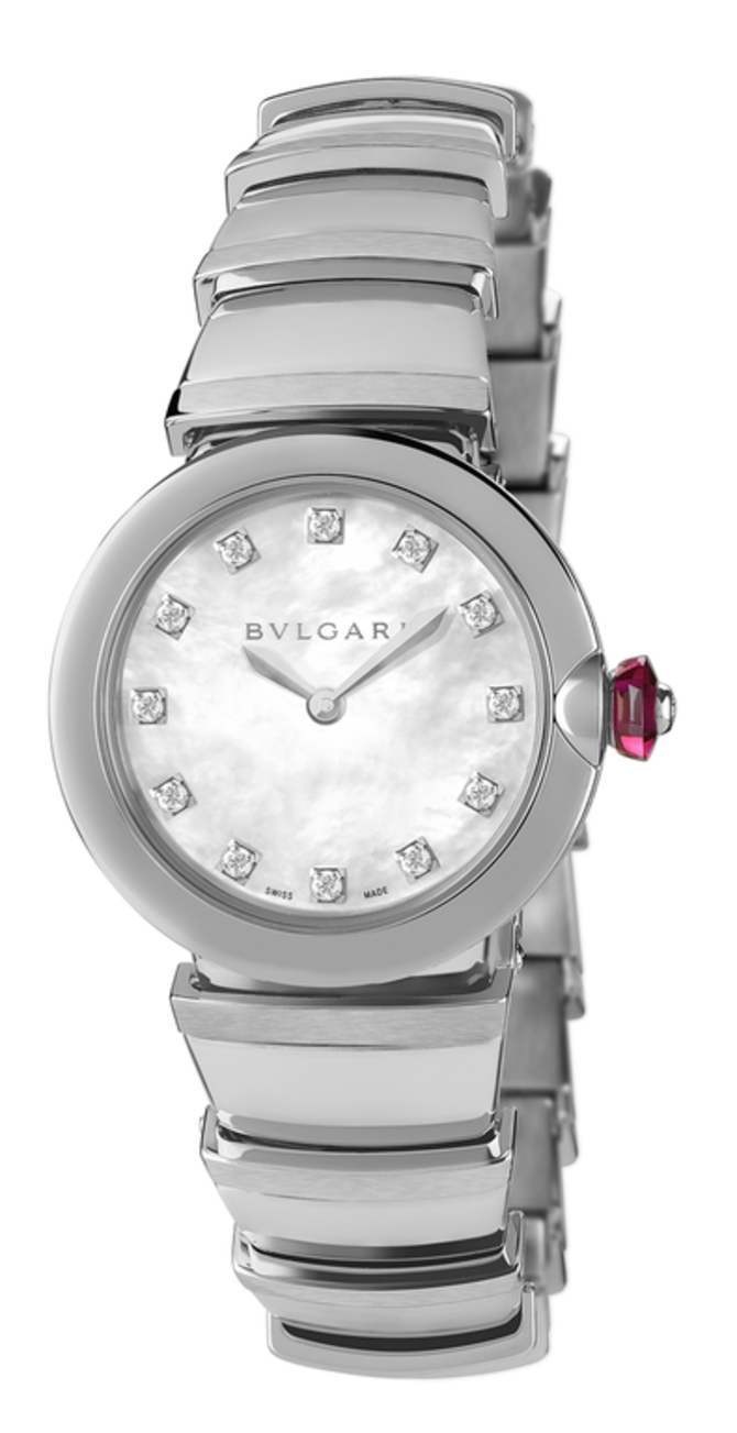 Женские швейцарские часы LVCEA 102196 от часовой марки Bvlgari были выпущены в корпусе из нержавеющей стали в комплекте с прочным браслетом также из нержавеющей стали. Застежка на браслете раскладного типа. Внутри корпуса размещен кварцевый механизм разработки специалистов мануфактуры Bvlgari. Размер корпуса: 28 мм; герметичность - 30 метров. На перламутровом циферблате стальными стрелками, что указывают на часовую разметку из бриллиантов, осуществляется индикация часов и минут. Для защиты циферблата на лицевую сторону корпуса установлено стекло из сапфира.