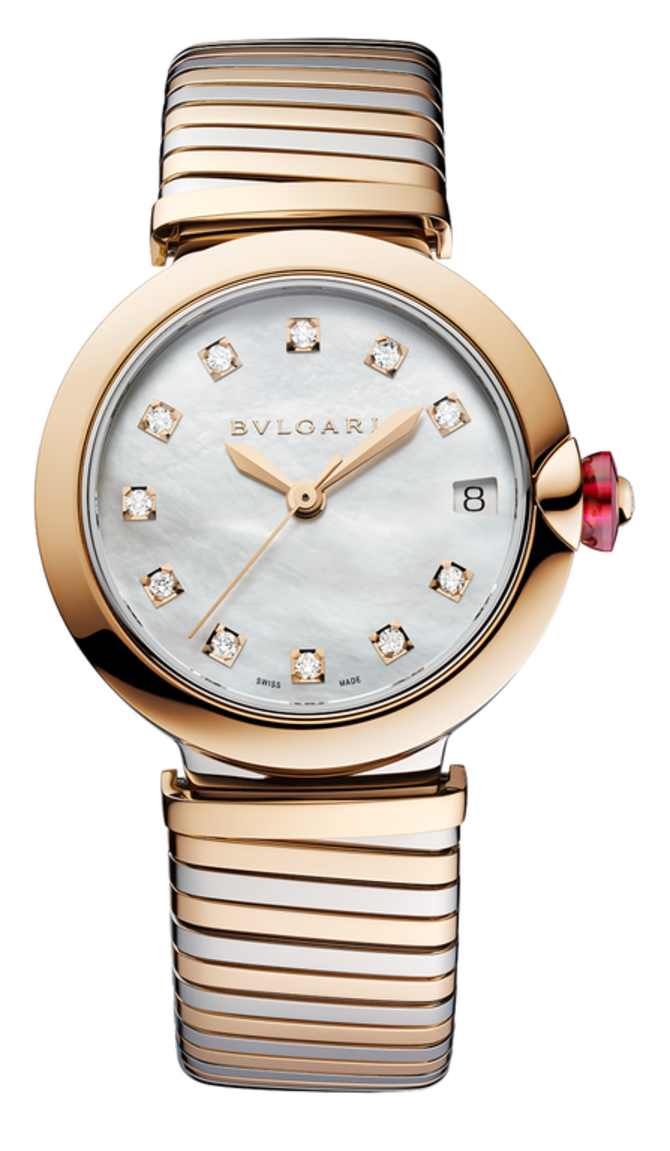 Швейцарские часы для женщин Bvlgari Lvcea Tubogas 102954 выпущены на базе мануфактурного автоматического калибра с запасом хода на 42 часа производства марки Bvlgari. Установленный механизм способствует индикации часов, минут, секунд и даты на циферблате из натурального морского перламутра, с часовыми метками из натуральных белых бриллиантов и стрелками из розового золота. Комбинированный круглый корпус, диаметром 33 мм, сделан из розового 18-каратного золота и нержавеющей стали. Браслет состоит из тех же металлов, что и корпус. Индикатор даты находится в области отметки "3 часа". Розовый сапфир украшает заводной ключ, расположенный с левой стороны корпуса.