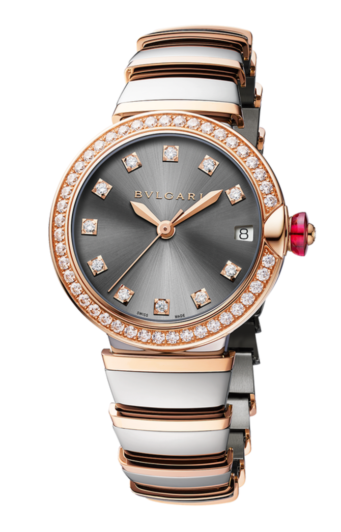 Корпус наручных часов Bulgari LVCEA Pink Gold Stainless Steel Brilliant выполнен из розового золота в комбинации с нержавеющей сталью. На черном сатинированном циферблате с часовой разметкой из бриллиантов осуществляется индикация часов, минут, секунд, даты. Стрелки выполнены из розового золота. Внутри часов установлен механический калибр с автоматическим подзавдом. Браслет выполнен в той же комбинации, что и корпус, а также оснащен застежкой раскладного типа. Корпус инкрустирован бриллиантами классической огранки. Герметичность рассчитана на 30 метров.