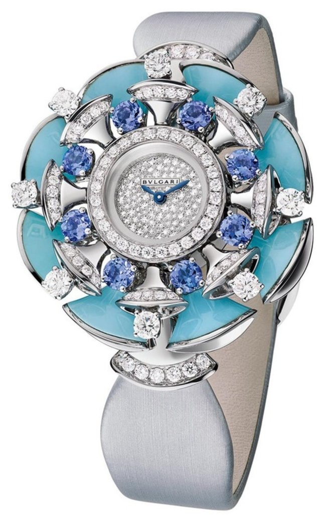 Крупные ювелирные наручные часы для женщин представили специалисты итальянского бренда Bvlgari, имеющего мануфактуру по производству часов в Швейцарии, городе Невшеталь. Корпус из белого золота обладает роскошным безелем, декорированным белыми бриллиантами и синими сапфирами. Часы выпущены в стиле известной римской мозаики и мотивов императора Каракаллы. Индикация часов и минут обеспечена кварцевым механизмом мануфактурного производства Bvlgari. На бриллиантовом циферблате расположены синие стрелки из вороненой стали. Стекло, которое накрывает лицевую часть корпуса, выполнено из сапфира. Сатиновый ремешок и золотая пряжка - в комплекте.