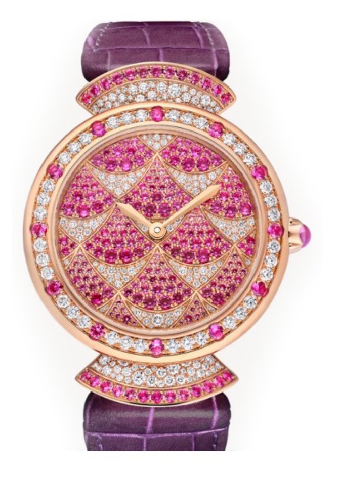 Ювелирная модель женских наручных часов от компании Bvlgari - Diva's Dream Mosaica 103760 выпущена в корпусе из розового золота, диаметром 37 мм, с инкрустацией белыми бриллиантами и розовыми сапфирами. Часы сквозь стекло из сапфирового кристалла демонстрируют данные текущего времени посредством автоматического мануфактурного механизма BVL191. Стрелки выполнены из золота. Часы укомплектованы ремешком из натуральной кожи аллигатора фиолетового цвета и золотой классической застежкой. Год выпуска часов - 2023. Герметичность корпуса - 30 метров.