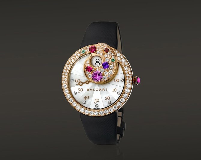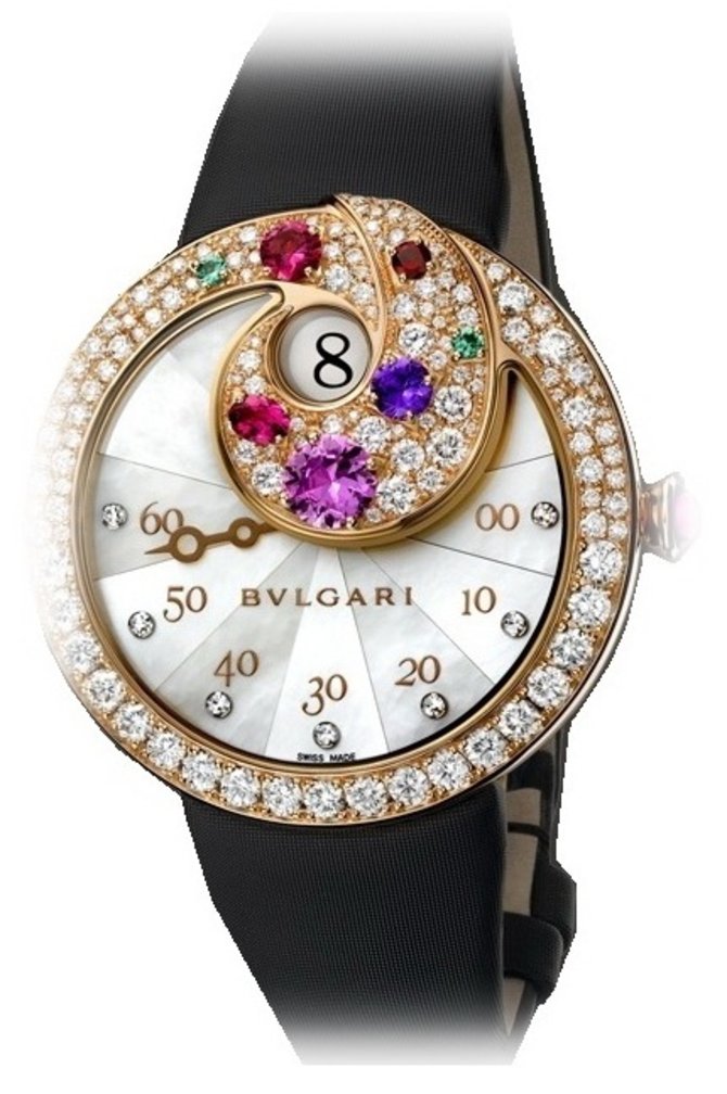 Компания Bvlgari представила модель наручных часов для женщин в круглом ювелирном корпусе из розового золота с 30-метровой герметичностью. Корпус инкрустирован белыми бриллиантами, рубинами, сапфирами и изумрудами. Циферблат, который информирует владельца о текущем времени (часы, минуты), закрыт сапфировым стеклом с антибликовым покрытием. Диаметр корпуса - 40 мм. Атласный ремешок дополнен классической пряжкой из золота. Внутри корпуса установлен мануфактурный механизм с автоподзаводом.