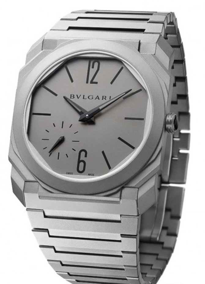Швейцарская часовая мануфактура Bvlgari выпустила наручные часы Octo Finissimo Automatic 102713 в корпусе из титана, диаметром 40 мм, внутри которого размещен мануфактурный калибр с автоподзаводом BVL 138. Он отвечает за индикацию текущего времени на сером циферблате. Запас ход этой модели рассчитан на 60 часов. Защитное стекло выполнено из сапфирового кристалла с противобликовым эффектом. В комплекте поставляется браслет из нержавеющей стали с раскладной пряжкой. Герметичность корпуса - 30 метров (3 bar).