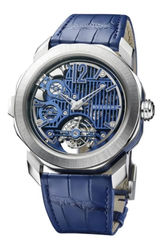 Швейцарская часовая мануфактура Bvlgari в 2022 году выпустила наручные часы Octo Roma Blue Carillon Tourbillon 103627 ограниченным тиражом в 30 экземпляров на весь мир. В корпусе из платины, диаметром 44 мм, установлен мануфактурный калибр с ручным подзаводом BVL428, что отвечает за индикацию текущего времени. Также часы оснащены функциями турбийона, минутного репетира и индикатором запаса хода, что в этой модели рассчитан на 75 часов. Защитное стекло выполнено из сапфирового кристалла с противобликовым эффектом. Ремень из кожи аллигатора дополнен платиновой застежкой.