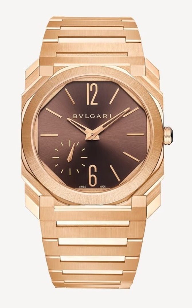 Часовая марка BVLGARI представила модель наручных часов Octo Finissimo Automatic с такими функциями: часы, минуты, секунды. Корпус изготовлен из розового золота в диаметре 40 мм. Циферблат защищен стеклом из сапфирового кристалла с противобликовым составом сверху. Механический калибр с автоподзаводом BVL138 оснащен запасом хода на 60 часов. На запястье часы крепятся с помощью золотого браслета и раскладной застежки. Герметичность корпуса - 100 метров.