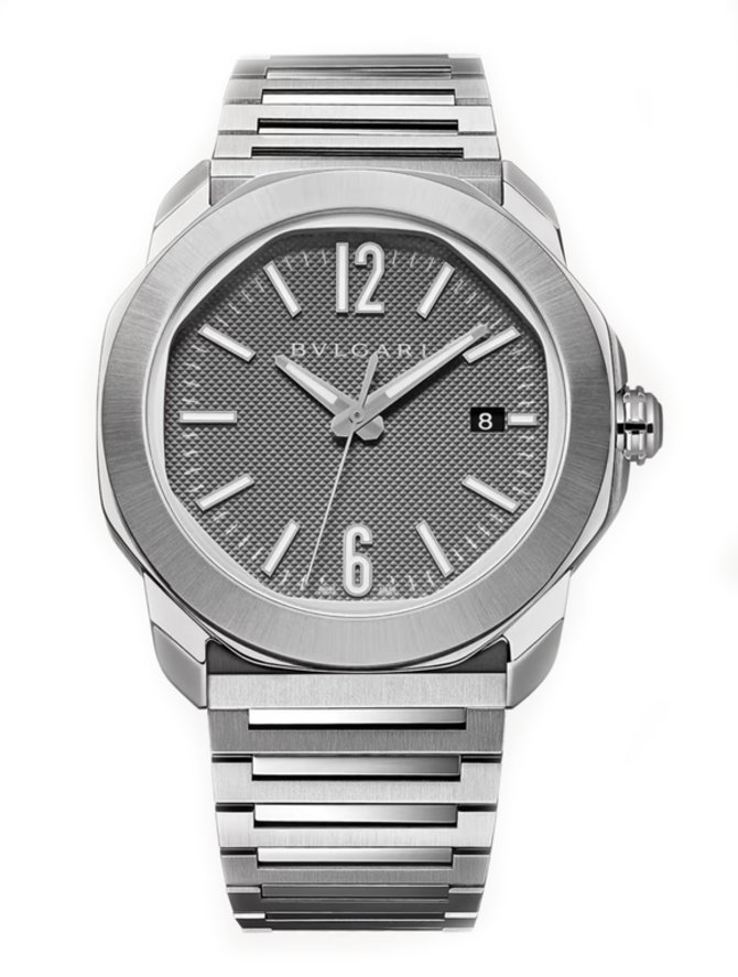 Часовая мануфактура Bvlgari представляет швейцарские часы Octo Roma 103740 в корпусе из стали, размером 41 мм, со 100-метровой водонепроницаемостью. Часы функционируют на базе механического калибраBVL 191с автоподзаводом и запасом хода на 42 часа. На циферблате отображаются часы, минуты, секунды, дата. Часы поставляются в комплекте со стальным браслетом и раскладной застежкой. Гильошированный циферблат защищен выпуклым стеклом из сапфирового кристалла с антибликовым покрытием. На часовые метки и стрелки нанесен люминесцентный состав, что позволяет считывать показания в темноте. Часы выпущены в 2023 году.