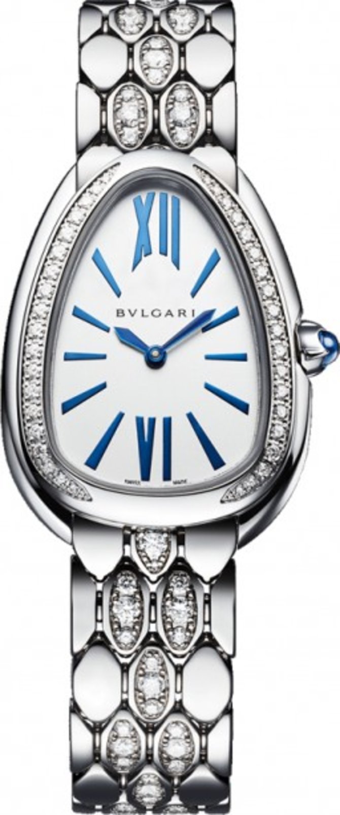 Кварцевая модель наручных швейцарских часов Bvlgari Serpenti Seduttori 103276 представлена в корпусе, выполненном в форме змени из белого 18-каратного золота, диаметром 33 мм, что украшен бриллиантами классической огранки белого цвета. В часах установлен кварцевый мануфактурный калибр от специалистов Bvlgari. Он обеспечивает показания часов и минут на белом циферблате с синей разметкой. В комплекте с часами поставляется браслет из белого золота с инкрустацией бриллиантами. Защитное стекло, установленное на лицевой стороне корпуса, выполнено из сапфирового кристалла. Безель корпуса украшен бриллиантами. Часы Bvlgari Serpenti Seduttori 103276 были выпущены Bvlgari в 2021 году. Водонепроницаемость корпуса рассчитана на 50 метров.