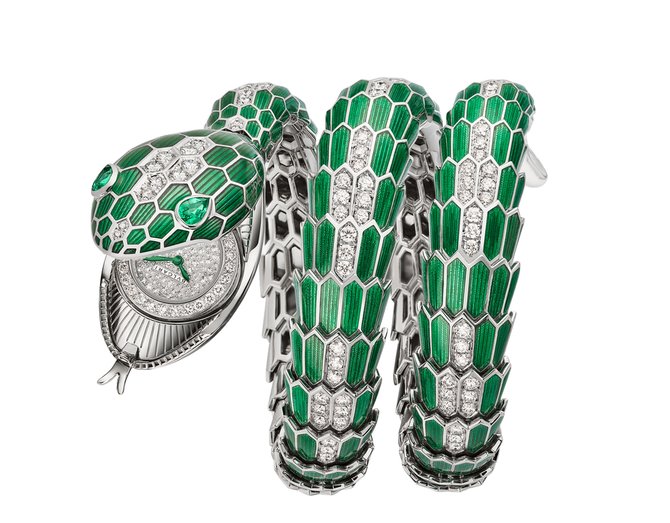 Художественная модель женских швейцарских часов от часовой марки Bvlgari - Serpenti Jewellery Misteriosi Secret 103560. Корпус и браслет из белого золота образуют образ змеи. Внутри часов установлен механический калибр BVL 100 с запасом хода на 30 часов. Часы инкрустированы бриллиантами. Циферблат закрыт сапфировым стеклом. Глаза змеи выложены изумрудами. Водонепроницаемость корпуса рассчитана на 30 метров.