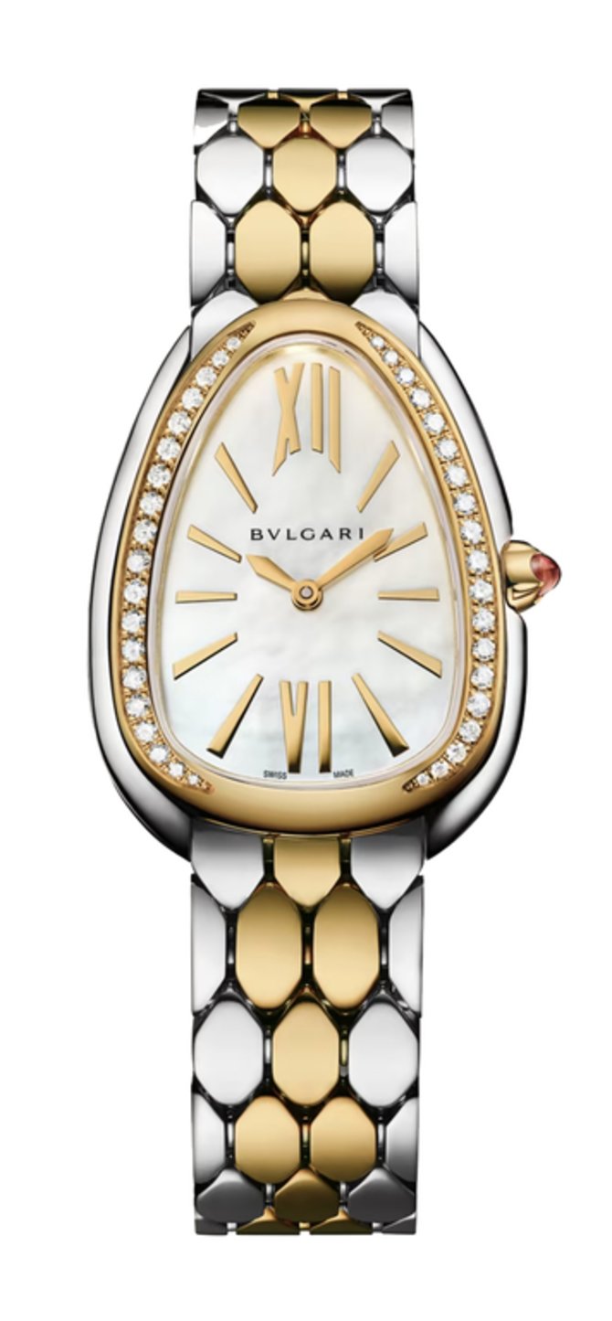 Швейцарские часы Serpenti Seduttori от Bvlgari выпущены в корпусе из нержавеющей стали и желтого золота. Перламутровый циферблат демонстрирует завораживающую игру контрастов. Гибкий и обволакивающий браслет, вдохновленный чешуей змеи, имеет шестиугольный узор, символизирующий идеальное сочетание мира ювелирных украшений и часового искусства. Часы Serpenti Seduttori обладают кварцевым механизмом. Диаметр корпуса - 33 мм. Заводная головка из желтого золота украшена розовым рубеллитом огранки кабошон. Браслет из нержавеющей стали и желтого золота с раскладывающейся застежкой. Водонепроницаемость корпуса до 30 метров. Защитное стекло из сапфирового кристалла покрыто противобликовым составом. Часовые метки и стрелки сделаны из золота. Браслет инкрустирован натуральными бриллиантами белого цвета классической огранки.