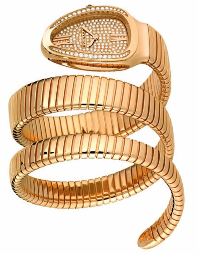 Коллекция "Sarpenti", основанная ювелирно-часовой компанией Bvlgari, с итальянского переводится как "змеи". Действительно, швейцарские часы, входящие в эту линейку, вместе с корпусом и браслетом образуют форму змеи. Голова змеи - это корпус часов, в котором расположено их сердце - кварцевый швейцарский механизм мануфактурного производства Bvlgari. Также на "голове" находится циферблат, индицирующий часы и минуты. Ободок корпуса и циферблат декорированы белыми бриллиантами. Корпус и браслет выполнены из розового золота. Браслет выступает продолжением корпуса и прочно прилегает к запястью. Застежка отсутствует. Циферблат накрыт стеклом из сапфира.