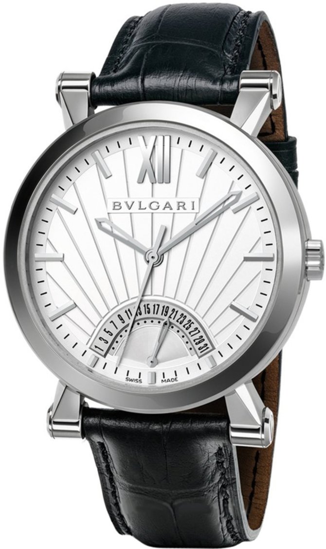 Известный бренд Bvlgarii представляет вашему вниманию элегантные и практичные швейцарские часы модели Retrograde Date. Данная можель мужских часов изготовлена из нержавеющей стали, солидно сочетаясь с черным ремешком. Ремешок изготовлен из кожи аллигатора. Он фиксируется на руке классической застежкой, изготовленной также из нержавеющей стали. Водонепроницаемость часов - 30 метров. Корпус круглой формы с простым негравированным безелем, диаметром 42 миллиметра. Функции модели Retrograde Date стандартные: часы, минуты, секунды, дата. Но индикатор даты ретроградный и дугообразный - находится в нижней части циферблата. Запас хода - 42 часа. Циферблат белого цвета, гильошированный с классическими часовыми метками и римской цифрой 12.