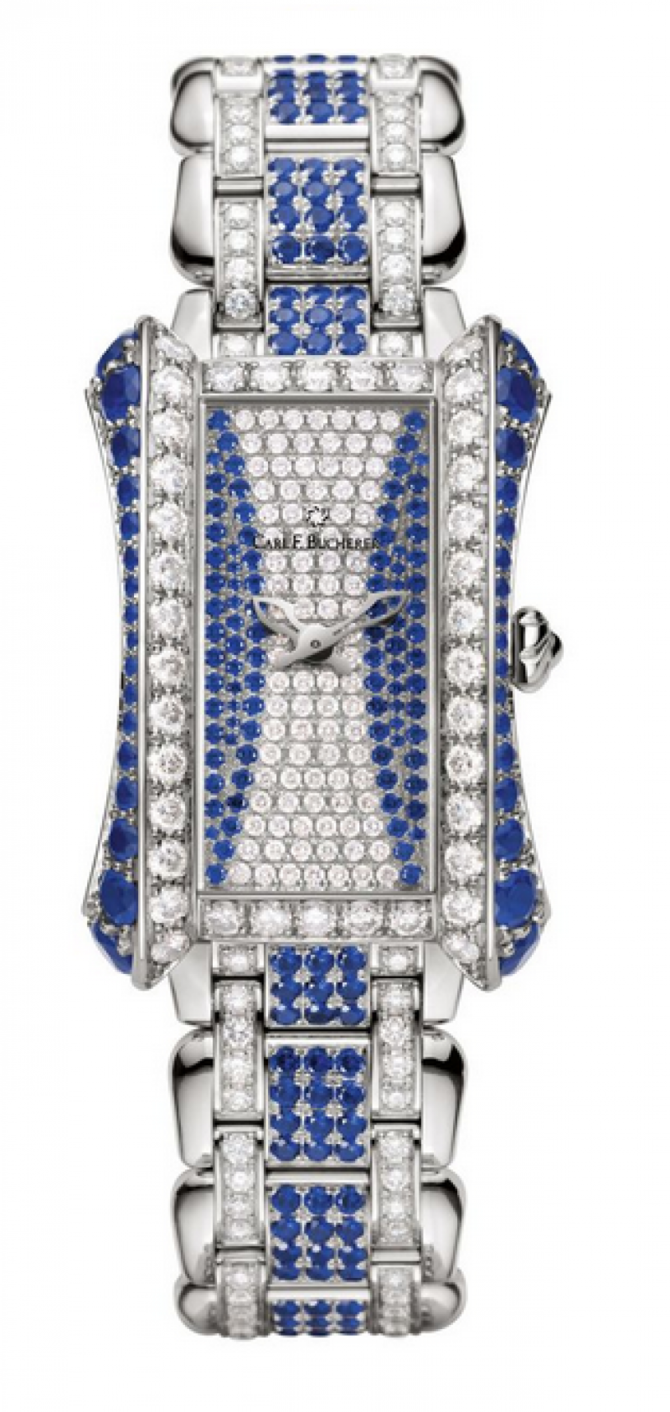 Часы, вышедшие лимитированной серией всего из 25 экземпляров, представлены в корпусе из белого золота, полностью инкрустированном драгоценными камнями. К примеру, на корпусе размещены 100 бриллиантов TW vvs 3,0 карата и 34 синих сапфира 32/24; на браслете 136 бриллиантов TW vvs 2,9 карата и 210 синих сапфиров 32/24 1-й группы качества 5,0 каратов. Часы функционируют благодаря кварцевому Калибру CFB 1850. Кристаллы кварца движутся за счет энергии батареи, которая, в зависимости от хода, служит от двух до трех лет. В это время на точность часов не влияет разрядка батареи. Коллекция ALACRIA: эксперт в ювелирном деле; исследования в области совершенного внешнего вида и новой формы; получение женского концепта во всех аспектах дизайна; изогнутая форма с выступающими гранями; игра полированных и матовых поверхностей; особый дизайн стрелок; эксклюзивный дизайн заводной коронки, украшенной логотипом; собственный шрифт Carl F. Bucherer; независимый дизайн циферблатов; персонализированные застежки.