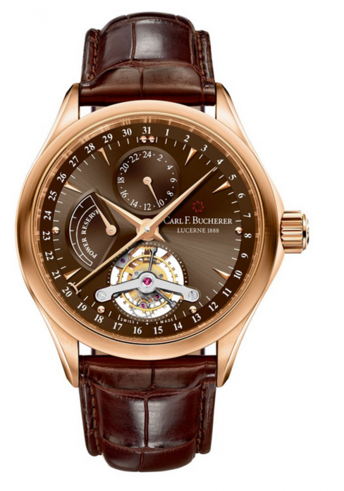 Ограниченная серия швейцарских часов Carl F.Bucherer Manero Tourbillon Limited Edition 00.10918.03.93.01. Часы выпущены в количестве 188 экземпляров. Классическая и элегантная модель пополнила коллекцию бренда Carl F.Bucherer - Manero. Швейцарская марка Carl F.Bucherer была основана еще в 1888 году в Люцерне. На циферблате расположено открытое скелетонизированное окно турбийона. Стекло сапфировое. В комплекте - ремешок из кожи крокодила коричневого цвета. Также часы отличаются функцией индикации времени второго часового пояса - GMT. На коричневом циферблате гармонично смотрятся золотые часовые метки и стрелки. Корпус полированный мастером вручную. Механизм CFB T1001 с 70-часовым запасом хода, а также ручным подзаводом. Модель укомплектована классической застежкой из розового золота. К тому же, корпус выполнен из того же металла. Размеры корпуса: 41.8 х 12.58 мм.