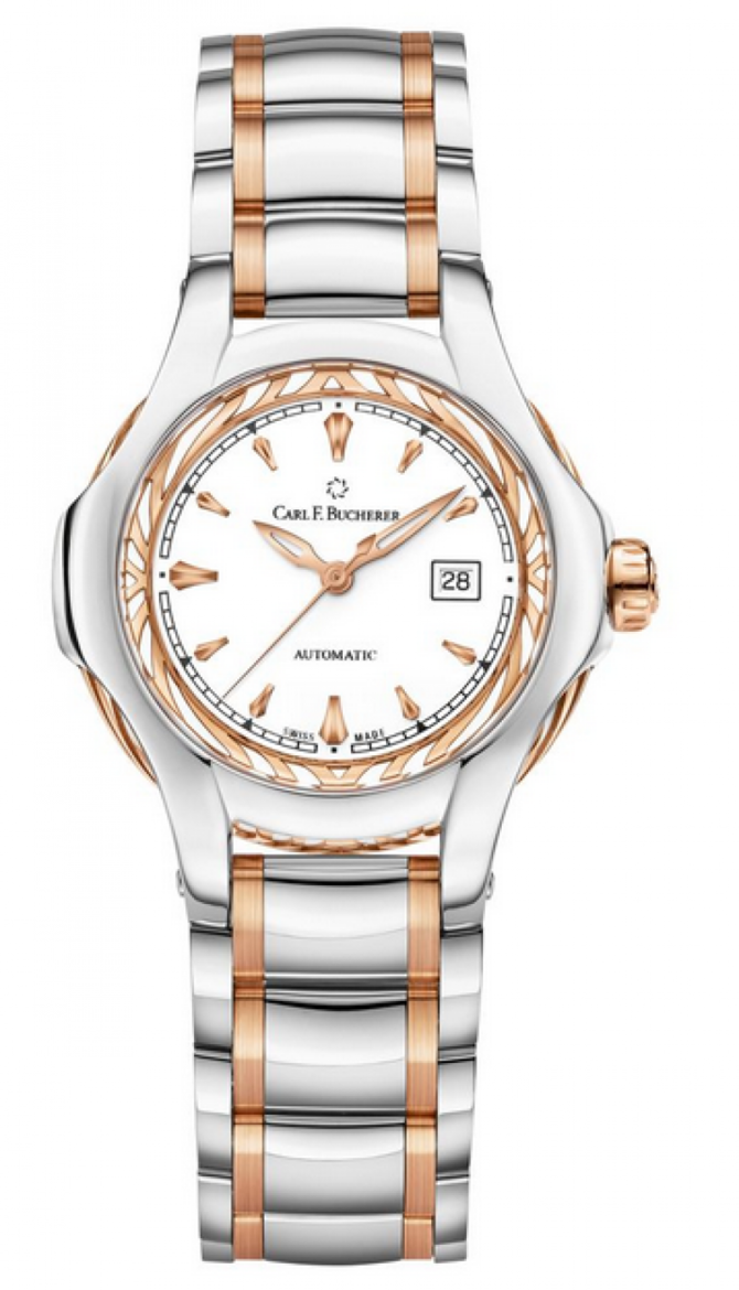 Дамская модель наручных часов от швейцарского часового бренда Carl F. Bucherer в комбинированном корпусе, выполненном из розового 18-каратного золота и нержавеющей стали. Циферблат защищает сапфировое стекло с односторонним антибликовым покрытием. Задняя крышка часовой модели выполнена из сапфирового стекла, через которое можно следить за работой механизма с автоматическим подзаводом, на 25 драгоценных камнях и с 38-часовым запасом хода (Калибр CFB 1963). Водостойкость корпуса - 30 метров. Браслет часов также комбинированный, из нержавеющей стали и розового золота с раскладывающейся застежкой. Структура бренда Carl F. Bucherer: Ste-Croix - служащих: 28, научные исследования, разработки, производство модулей и механизмов, сборка механизмов, производство прототипов и тестирование; Lengnau - служащих: 25, установка циферблатов и стрелок, «посадка» механизма в корпус, установка браслета/ремня, послепродажное обслуживание.