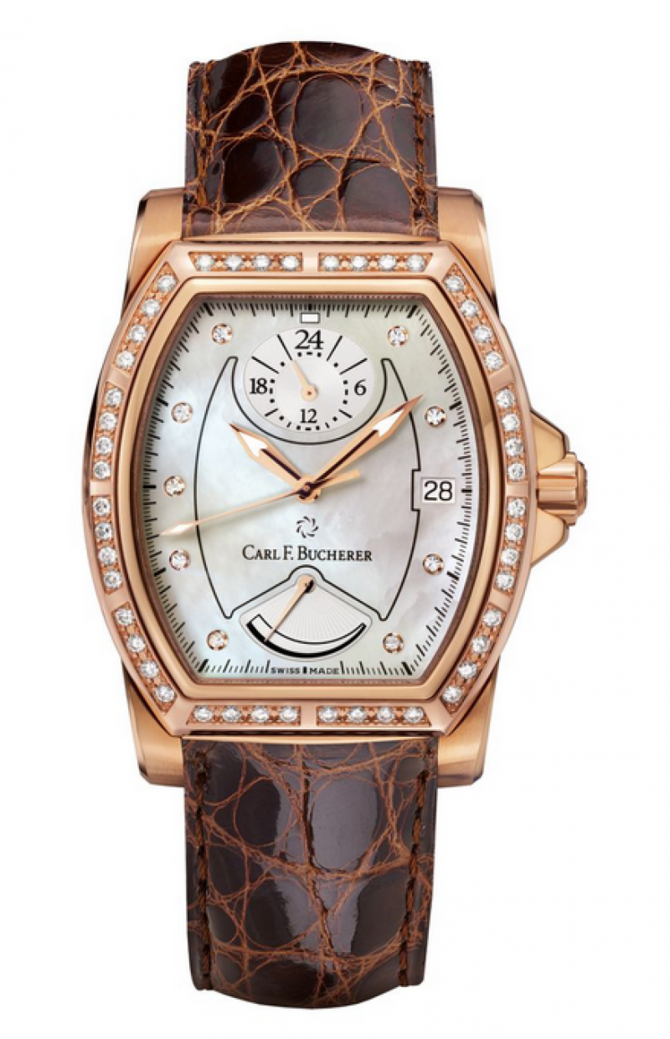 Представленная модель наручных часов инкрустирована настоящими белыми бриллиантами (TW vvs) в количестве 48 штук, общим весом 0,6 карата. Часовые метки часов также заменяют драгоценные камни. В часах Patravi T-24 использован интересный механизм автоматического подзавода. Например, 24-часовая индикация настраивается независимо от часовой и минутной стрелки, поэтому ее можно, при желании, использовать для двух часовых поясов. Индикация запаса хода позволяет не упустить момент подзавода. Кроме того, часы Patravi T-24, отличающиеся изысканностью и элегантностью, имеют оригинальную, оптимизированную в плане эргономики, бочкообразную форму корпуса. Вращая заводную головку против часовой стрелки, Вы можете изменить дату. Затем установить текущее время «до полудня» или «после полудня». Представленные часы прошли испытания под давлением в 5 атмосфер, то есть соответствующее глубине 50 метров. Их спокойно можно не снимать в ванне, во время принятия душа или купания в бассейне либо на пляже. Обратите внимание, что водонепроницаемость корпуса гарантируется только при условии ввинченной внутрь заводной головке. Мастера бренда советуют проверять ее раз в год. Carl F. Bucherer дает двухлетнюю гарантию на свои продукты с даты покупки.
