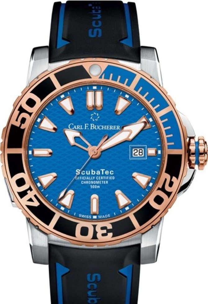 Наручные швейцарские часы Carl F.Bucherer Patravi ScubaTec выпущены специальной серией на мануфактурном автоматическом калибре CFB 1950.1 с сертификатом хронометра, выданным COSC - швейцарским институтом хронометрии. Механизм отвечает за индикацию часов, минут, секунд и даты, которая осуществляется на синем циферблате с золотыми метками и стрелками, покрытыми люминесцентным покрытием. Но главным достижением модели ScubaTec (реф. 00.10632.24.53.01) является дайверская водонепроницаемость корпуса до 500 метров. Корпус произведен в комбинации нержавеющей стали и розового золота. Запас хода механизма составляет 38 часов. Циферблат накрыт сапфировым стеклом с противобликовым покрытием.