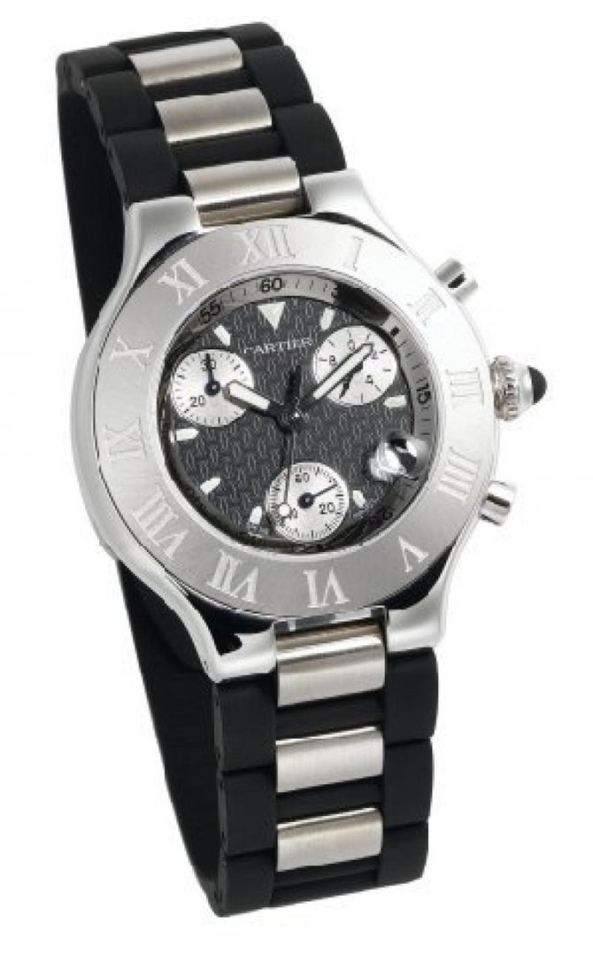 Пришло время ознакомиться с очередной коллекцией мужских наручных часов Calibre de Cartier, от известного во всем мире производителя часов Cartier, который завоевал сердца миллионов своими безупречными часовыми шедеврами в которые входят как и классические модели так и многофункциональные оригинальные часы. Рассмотрим модель 21 Chronoscaph Large W10125U2. Корпус выполнен в круглой форме, сделан из нержавеющей стали. В диаметре размер корпуса составляет 43.8 x 38.5 мм. Основные функции модели это часы, минуты, секунды, дата. Наверное главная особенность часов - это пожалуй функция хронографа. Индикатор даты находится в положении четырех часов. Как видим модель действительно многофункциональна. На циферблате великолепно смотрятся римские цифры. Также стоит упомянуть отлитые вручную из вороненной стали стрелки, которые ходят по черному гильошированному циферблату. Циферблат закрывает прочное сапфировое стекло, а значит можно не переживать на счет появления царапин и прочих повреждениях. Кварцевый механизм с оснащен калибром Cartier 272. Браслет часов комбинированный, выполнен из каучука а также нержавеющей стали. Водонепроницаемость модели увеличена по сравнению со стандартами, и составляет сто метров.
