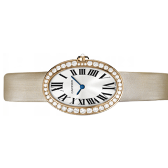 Представляем вашему вниманию, очередную модель женских наручных часов от всемирно известного французского производителя часов и ювелирных изделий Cartier. Название модели Baignoire Small WB520004 которые находятся в коллекции "Baignoire". Сразу хотелось сказать, что часы заинтересуют как и любительниц исключительно женственных дизайнов, так и любительниц надежных простых устройств. Корпус выполнен в форме овала, отполирован до блеска, сделан из восемнадцати каратного розового золота, и имеет такие размеры: 31.6 x 24.5 x 8.2 мм. Основные функции модели это часы, минуты. Механизм часов кварцевый, оснащен калибром Cartier 057. Циферблат серебристого цвета. Атласный ремешок кремового цвета оснащен золотой вставкой а также откидной застежкой. На серебристом циферблате находятся стрелки, которые отлиты вручную из вороненной стали. И что касается водонепроницаемости, она более стандартна и составляет тридцать метров. Заводной ключ инкрустирован белым бриллиантом. Корпус закрывает прочное стекло выполненное из сапфира. Задняя крышка часов закрыта под давлением. Безель украшен белыми бриллиантами, что конечно же понравится любительницам драгоценностей.