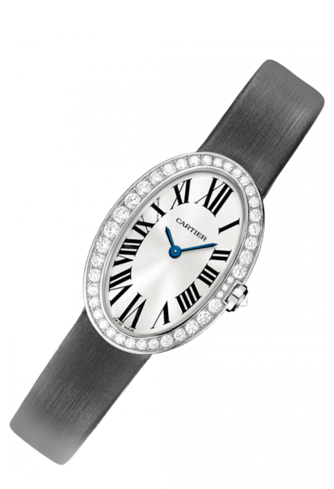 Представляем вашему вниманию, очередную модель женских наручных часов от всемирно известного французского производителя часов и ювелирных изделий Cartier. Название модели Baignoire Small WB520008 которые находятся в коллекции "Baignoire". Сразу хотелось сказать, что часы заинтересуют как и любительниц исключительно женственных дизайнов, так и любительниц надежных простых устройств. Корпус выполнен в форме овала, отполирован до блеска, сделан из восемнадцати каратного белого золота, и имеет такие размеры: 31.6 x 24.5 x 8.2 мм. Основные функции модели это часы, минуты. Механизм часов кварцевый, оснащен калибром Cartier 057. Циферблат серебристого цвета. Атласный ремешок серого цвета оснащен откидной застежкой а также золотой вставкой. На серебристом циферблате находятся стрелки, которые отлиты вручную из вороненной стали. И что касается водонепроницаемости, она более стандартна и составляет тридцать метров. Заводной ключ инкрустирован белым бриллиантом. Корпус закрывает прочное стекло выполненное из сапфира. Задняя крышка часов закрыта под давлением. Безель украшен белыми бриллиантами, что конечно же понравится любительницам драгоценностей.