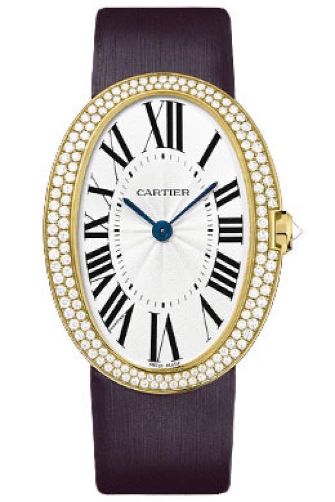 Представляем вашему вниманию, очередную модель женских наручных часов от всемирно известного французского производителя часов и ювелирных изделий Cartier. Название модели Baignoire Large WB520022 которые находятся в коллекции "Baignoire". Сразу хотелось сказать, что часы заинтересуют как и любительниц исключительно женственных дизайнов, так и любительниц надежных простых устройств. Корпус выполнен в форме овала, отполирован до блеска, сделан из восемнадцати каратного желтого золота, и имеет такие размеры: 44 x 34.07 x 10.05 мм. Основные функции модели это часы, минуты. Механизм с ручным заводом оснащен калибром Cartier 430 MC. Циферблат серебристого цвета, гильошированный. Браслет часов матерчатый, выполнен из такого материала как атлас, баклажанового цвета .На серебристом гильошированном циферблате находятся стрелки, которые отлиты вручную. И что касается водонепроницаемости, она более стандартна и составляет тридцать метров. Заводной ключ инкрустирован белым бриллиантом. Корпус закрывает прочное стекло выполненное из сапфира. Задняя крышка часов закрыта под давлением. Безель украшен белыми бриллиантами, что несомненно порадует любительниц драгоценностей.