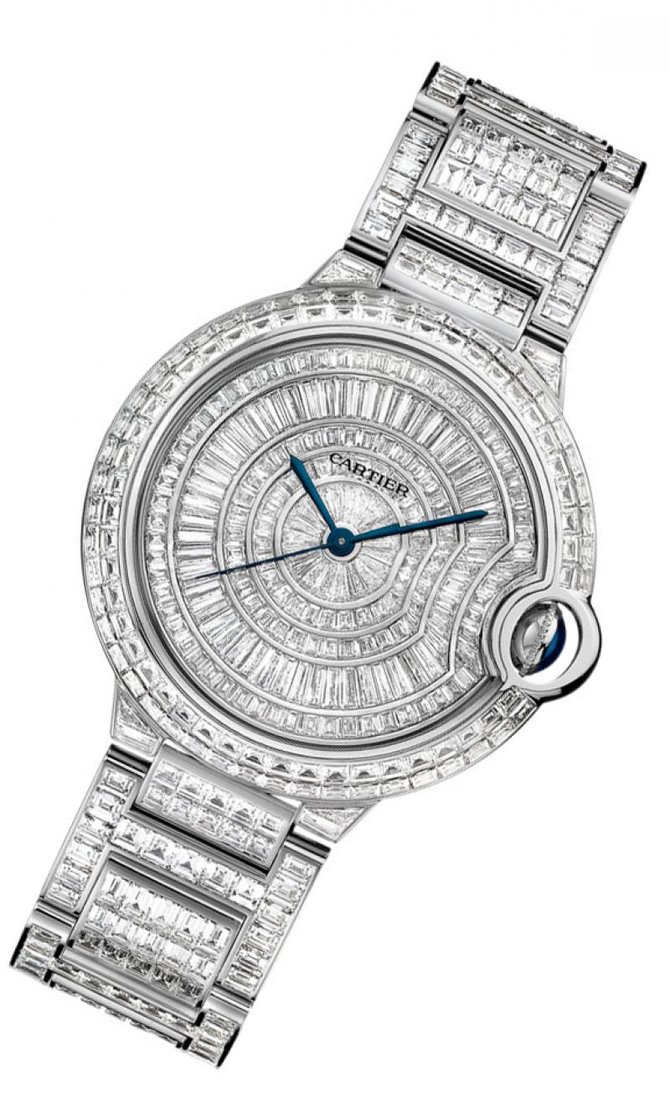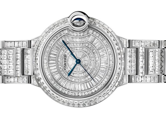 Представляем вашему вниманию, очередную модель женских наручных часов от всемирно известного французского производителя часов и ювелирных изделий Cartier. Название модели Ballon Bleu de Cartier Automatic 38 mm HPI00511 которые находятся в коллекции "Ballon Bleu de Cartier". Сразу хотелось сказать, что часы заинтересуют как и любительниц исключительно женственных дизайнов, так и любительниц надежных простых устройств. Корпус выполнен в форме круга, отполирован до блеска, сделан из белого восемнадцати-каратного золота, и имеет такие размеры: 38 х 12.16 мм. Основные функции модели это часы, минуты, секунды. Автоматический механизм часов оснащен калибром Cartier 076. Циферблат полностью покрыт белыми бриллиантами. Браслет часов также украшен белыми бриллиантами, сделан их белого золота, оснащен откидной вставкой. На циферблате находятся стрелки, которые отлиты вручную из вороненной стали. И что касается водонепроницаемости, она более стандартна и составляет тридцать метров. Заводной ключ инкрустирован синим кабошоном. Корпус закрывает прочное стекло выполненное из сапфира. Задняя крышка часов закрыта под давлением. Безель украшен белыми бриллиантами. Как видим, данная модель абсолютно подходит женщинам которые просто без ума от драгоценностей.