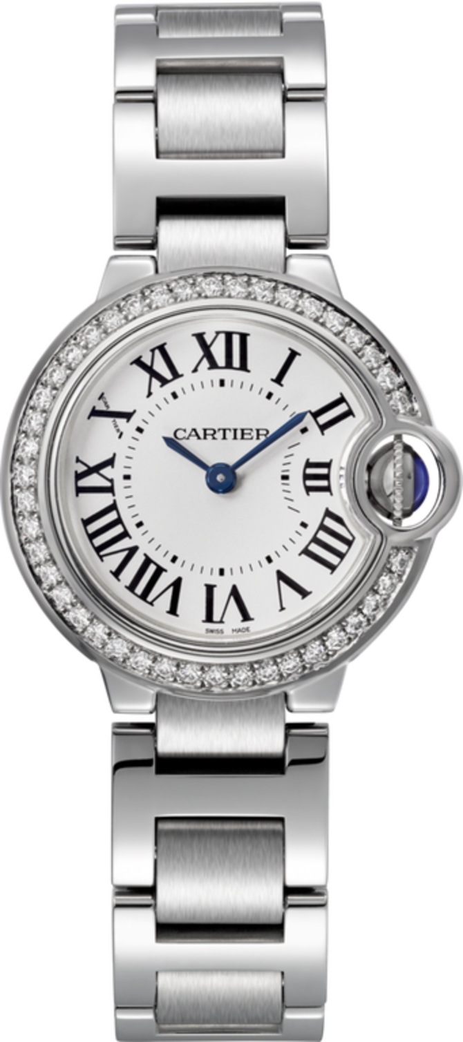 Кварцевые мануфактурные швейцарские часы Ballon Bleu de Cartier были выпущены в 28-миллиметровом корпусе из нержавеющей стали, украшенном множеством белых бриллиантов классической огранки. На белом гильошированном циферблате находятся черные римские часовые метки и стрелки из вороненой стали синего цвета, показывающие владельцу на данные часов и минут. Заводная головка, украшенная синим сапфиром-кабошоном, спрятана в основание стального корпуса. Подобного рода защита заводного ключа является запатентованной Cartier. Комплектуются часы браслетом из стали и раскладной пряжкой. Сапфировым стеклом защищен циферблат от повреждений.