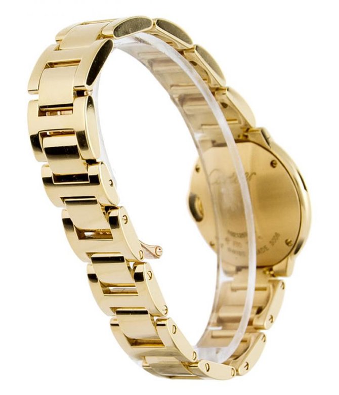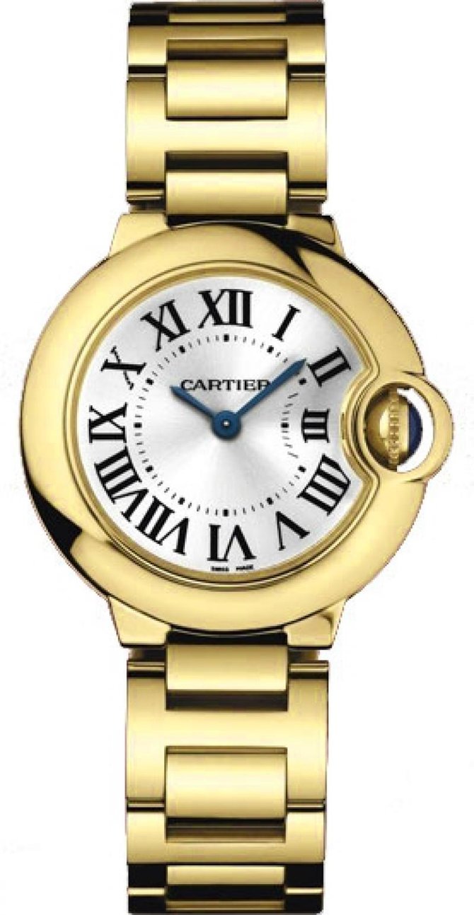 Представляем вашему вниманию, очередную модель женских наручных часов от всемирно известного французского производителя часов и ювелирных изделий Cartier. Название модели Ballon Bleu de Cartier Small Quartz W69001Z2 которые находятся в коллекции "Ballon Bleu de Cartier". Сразу хотелось сказать, что часы заинтересуют как и любительниц исключительно женственных дизайнов, так и любительниц надежных простых устройств. Корпус выполнен в форме круга, отполирован до блеска, сделан из желтого восемнадцати-каратного золота, и имеет такие размеры: 28 мм в диаметре. Основные функции модели это часы, минуты, секунды. Кварцевый механизм часов оснащен калибром Cartier 057. Циферблат серебристого цвета. Браслет часов как и весь корпус выполнен из 18-каратного желтого золота. На циферблате находятся стрелки, которые отлиты вручную из вороненной стали. И что касается водонепроницаемости, она более стандартна и составляет тридцать метров. Заводной ключ инкрустирован синим бриллиантом. Корпус закрывает прочное стекло выполненное из сапфира. Задняя крышка часов закрыта под давлением.