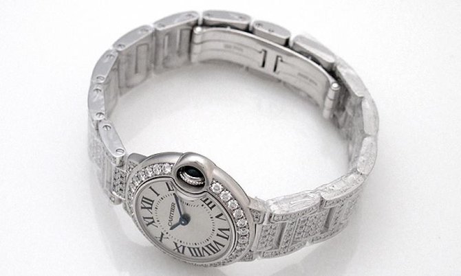 Представляем вашему вниманию, очередную модель женских наручных часов от всемирно известного французского производителя часов и ювелирных изделий Cartier. Название модели Ballon Bleu de Cartier Small Quartz WE9003ZA которые находятся в коллекции "Ballon Bleu de Cartier". Сразу хотелось сказать, что часы заинтересуют как и любительниц исключительно женственных дизайнов, так и любительниц надежных простых устройств. Корпус выполнен в форме круга, отполирован до блеска, сделан из белого восемнадцати-каратного золота, и имеет такие размеры: 28 мм в диаметре. Основные функции модели это часы, минуты. Кварцевый механизм часов оснащен калибром Cartier 057. Циферблат серебристого цвета. Браслет часов также выполнен как и весь корпус из белого золота в 18 карат, оснащен откидной застежкой. На циферблате находятся стрелки, которые отлиты вручную из вороненной стали. И что касается водонепроницаемости, она более стандартна и составляет тридцать метров. Заводной ключ инкрустирован синим бриллиантом. Корпус закрывает прочное стекло выполненное из сапфира. Задняя крышка часов закрыта под давлением. Любительницы драгоценностей не смогут пройти мимо данной модели, так как корпус часов и браслет украшены белыми бриллиантами.