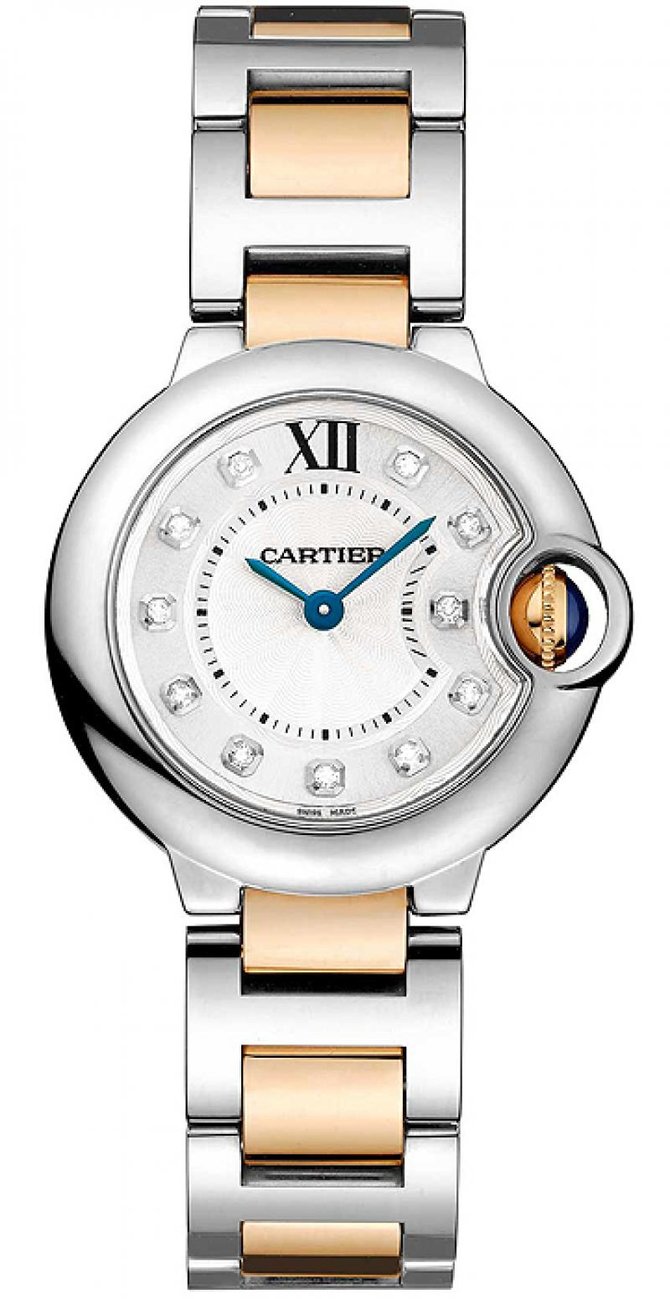 Представляем вашему вниманию, очередную модель женских наручных часов от всемирно известного французского производителя часов и ювелирных изделий Cartier. Название модели Ballon Bleu de Cartier Small Quartz WE902030 которые находятся в коллекции "Ballon Bleu de Cartier". Сразу хотелось сказать, что часы заинтересуют как и любительниц исключительно женственных дизайнов, так и любительниц надежных простых устройств. Корпус выполнен в форме круга, отполирован до блеска, сделан из нержавеющей стали, и имеет такие размеры: 28.6 x 9.35 мм. Основные функции модели это часы, минуты, секунды. Кварцевый механизм часов оснащен калибром Cartier 057. Циферблат серебристого цвета, украшен 11-ью бриллиантами. Браслет часов комбинированный, выполнен из восемнадцати каратного розового золота и нержавеющей стали, оснащен откидной застежкой. На циферблате находятся стрелки, которые отлиты вручную из вороненной стали. И что касается водонепроницаемости, она более стандартна и составляет тридцать метров. Заводной ключ инкрустирован синим бриллиантом. Корпус закрывает прочное стекло выполненное из сапфира. Задняя крышка часов закрыта под давлением.