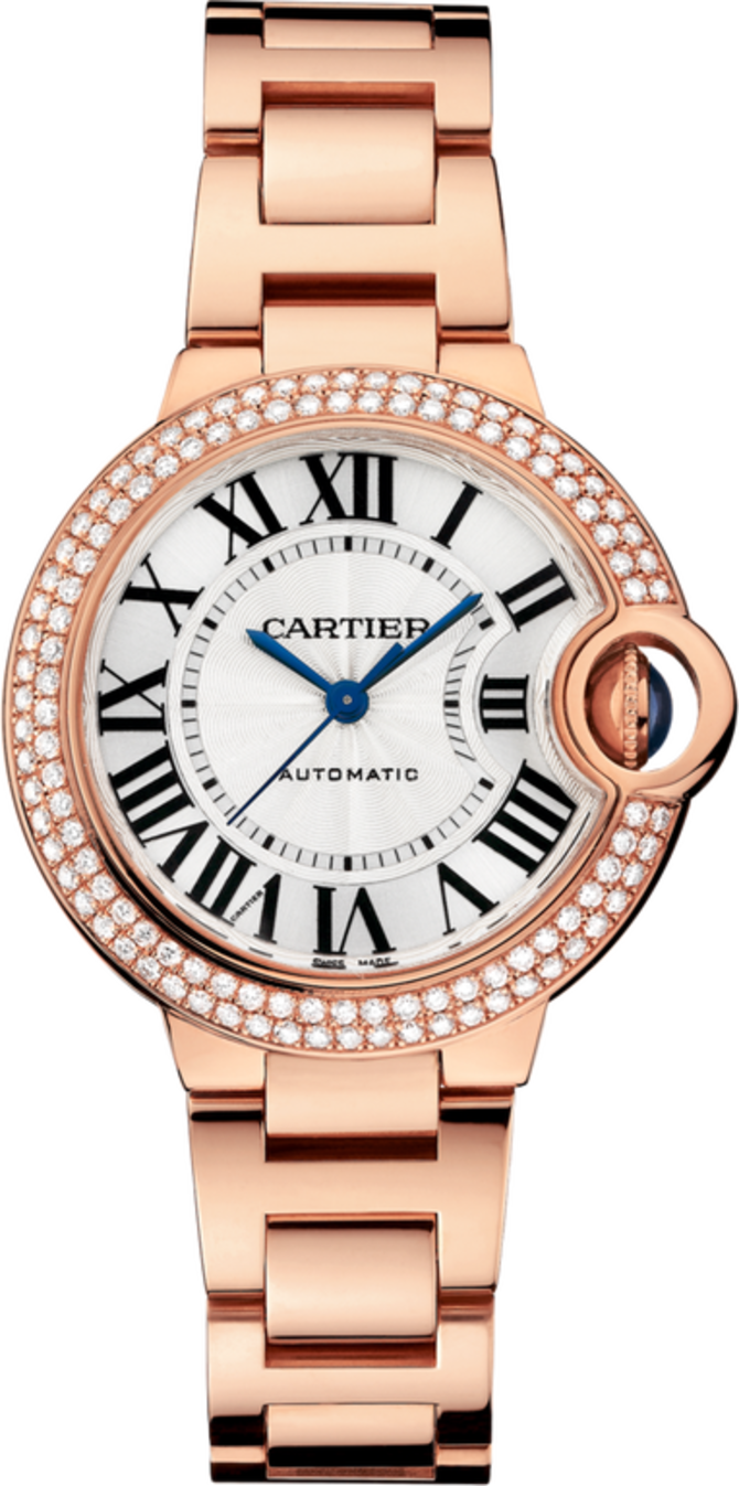 Золотые швейцарские часы Ballon Bleu de Cartier, представленные в корпусе из розового золота, диаметром 33 миллиметра, укомплектованы браслетом из розового золота с раскладной пряжкой. На циферблате серебристого цвета, гильошированном руками специалистов мануфактуры, в виде часовых меток установлены накладные римские цифры. Стрелками из вороненой стали указываются данные часов, минут и секунд. Заводная головка украшена синим сапфиром кабошоном и помещена под специальную защиту, исходящую из основы корпуса. Часы работают на базе механического механизма с автоматическим подзаводом, что был разработан и собран представителями марки Cartier. Минимальная водонепроницаемость корпуса - 30 метров. Безель украшен былыми бриллиантами.