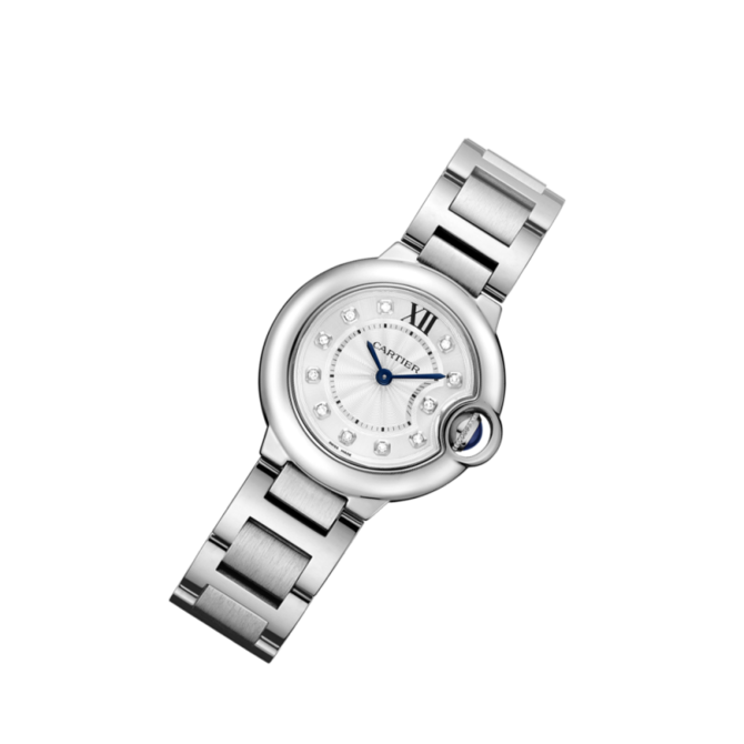 Представляем вашему вниманию, очередную модель женских наручных часов от всемирно известного французского производителя часов и ювелирных изделий Cartier. Название модели Ballon Bleu de Cartier Small Quartz WE902073 которые находятся в коллекции "Ballon Bleu de Cartier". Сразу хотелось сказать, что часы заинтересуют как и любительниц исключительно женственных дизайнов, так и любительниц надежных простых устройств. Корпус выполнен в форме круга, отполирован до блеска, сделан из нержавеющей стали, и имеет такие размеры: 28 x 9.35 мм. Основные функции модели это часы, минуты. Кварцевый механизм часов оснащен калибром Cartier 057. Циферблат серебристого цвета, украшен 11-ью бриллиантами. Браслет часов как и весь корпус, также выполнен из нержавеющей стали. На циферблате находятся стрелки, которые отлиты вручную из вороненной стали. И что касается водонепроницаемости, она более стандартна и составляет тридцать метров. Заводной ключ инкрустирован синим бриллиантом. Корпус закрывает прочное стекло выполненное из сапфира. Задняя крышка часов закрыта под давлением.
