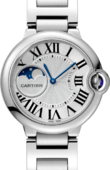 Компания CARTIER представила наручные часы в стальном круглом корпусе, в котором размещен мануфактурный механический калибр с автоматическим подзаводом, обладающий усложнением в виде астрономической функции - индикатором Лунных фаз. Также на гильошированном циферблате показываются часы и минуты синими стрелками из вороненой стали. Заводная головка спрятана в основание корпуса. Такая система защиты запатентована брендом CARTIER. Выпуклое стекло сделано из сапфирового кристалла и покрыто специальным составом, защищаюшим от бликов солнца. Ремень из кожи аллигатора идет в комплекте с моделью BALLON BLEU DE CARTIER 37 MM STEEL LEATHER (WSBB0020).